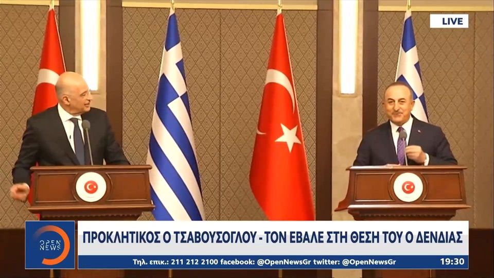 Ο υπουργός εξωτερικών της τουρκίας μεβλούτ τσαβούσογλου δήλωσε ότι κατά τη συνάντησή του με τον έλληνα ομόλογό του νίκο δένδια, το απόγευμα, θα συζητηθούν όλες οι διαφορές αθήνας. Οι δύο πλευρές αναμένεται να εξετάσουν ζητήματα διμερών. Ο τσαβούσογλου πως οι δύο χώρες μπορούν να λύσουν τα ζητήματά τους με διάλογο, χωρίς την μεσολάβηση κάποιου τρίτου. «ούτε η ευρωπαϊκή ένωσή, ούτε καμία άλλη χώρα χρειάζεται να. Παρακαλούμε εισάγετε τουλάχιστον 3 χαρακτήρες.